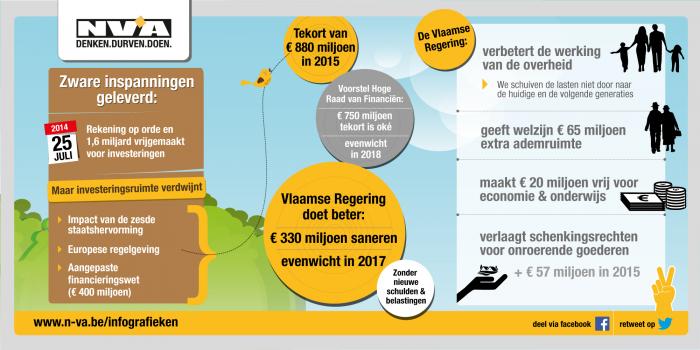 Door die tegenvallers moest de Vlaamse Regering voor deze begrotingscontrole uitgaan van een onvoorzien tekort van 880 miljoen euro. De Hoge Raad van Financiën had geadviseerd om dat tekort in de loop van 2015 af te bouwen tot 750 miljoen en een begrotingsevenwicht na te streven in 2018. Dat was echter buiten de ambitie van deze regering gerekend: “Bij de originele begrotingsopmaak van vorig jaar hadden we al zware saneringsinspanningen voorzien: 1,2 miljard in 2015 en 1,5 miljard in 2016”, verduidelijkt Bourgeois. “Dit jaar willen we nog 330 miljoen extra wegwerken. Zo beperken we het uiteindelijke tekort tot 550 miljoen euro: dat is 200 miljoen meer dan geadviseerd. Daarbij streven we naar een begrotingsevenwicht in 2017: één jaar vroeger dan geadviseerd.”